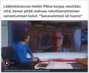 Lääkintöneuvos Heikki Pälve julkaisi Helsingin Sanomissa mielipidekirjoituksen 10.10.2021 ja totesi siinä muun muassa seuraavaa: ”Kun yhteiskunta tarjoaa maksuttoman ja turvallisen rokotuksen, siitä kieltäytymiseen pitäisi voida liittää myös vastuu seurauksista. Voisimmeko sopia, että määrätyistä rokotuksista kieltäytyminen periaatteellisin syin johtaa osittaiseen tai jopa täydelliseen korvausvastuuseen tämän sairauden hoidossa ja oheiskuluissa? Tämä koskisi esimerkiksi sairauslomakorvausta.”