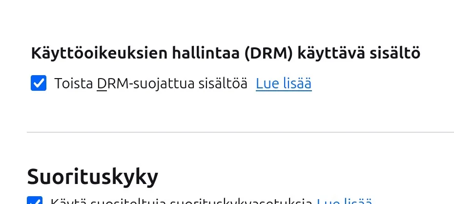 Korjausta aikaisempiin viesteihini eli en oo moista dvr asetusta edes huomannut, puhuin selaimen drm asetuksesta joka kaiketi pitää olla päälläEn löydä mistä sais sen dvr tilan