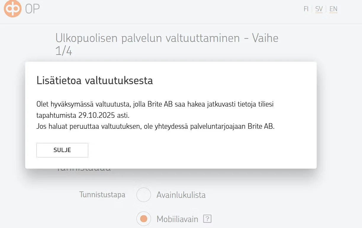 "Olet hyväksymässä valtuutusta, jolla ....... saa hakea jatkuvasti tietoja tiliesi tapahtumista 29.10.2025 asti."