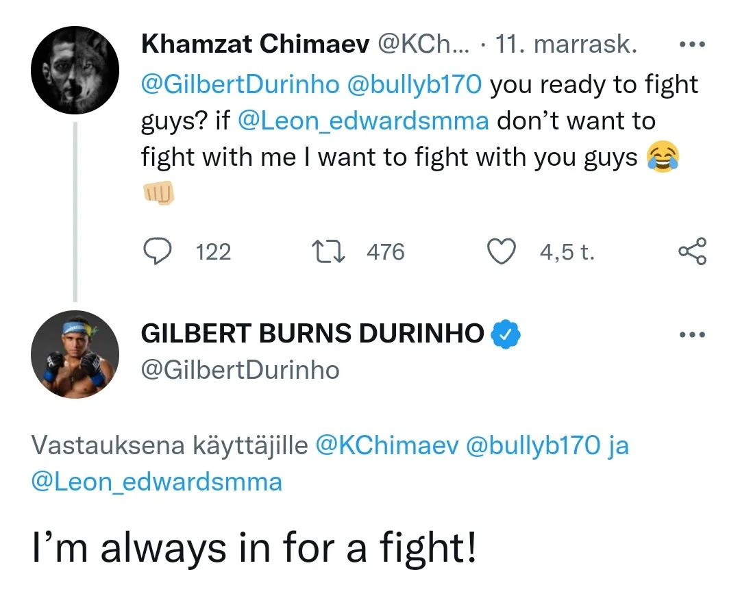UFC269 kortille vois ottaa varmaankin sit Khamzat-Burns, kun molemmat tarvitsevat vastustajaa ja ovat valmiita ottelemaan.