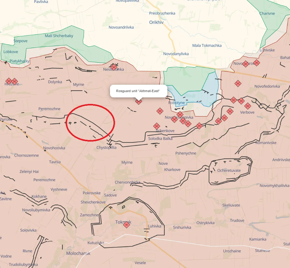 Tosin nyt on jännä paikka tiedossa, kun Robotynen vasemmalla puolella on Rosgardin Akhmat yksikkö, eli niitä Kadyrovin tsetseeni tiktok-sotilaita. Noita on käytetty aikaisemmin takalinjoissa vahtimassa, että mobikit ei vetäydy ja nyt nekin on jo etulinjassa. Tuossa näyttäisi olevan myös vähemmän puolustuslinjoja läpimurtoa varten. Nähdäänköhän tuolla etenemistä kohta?