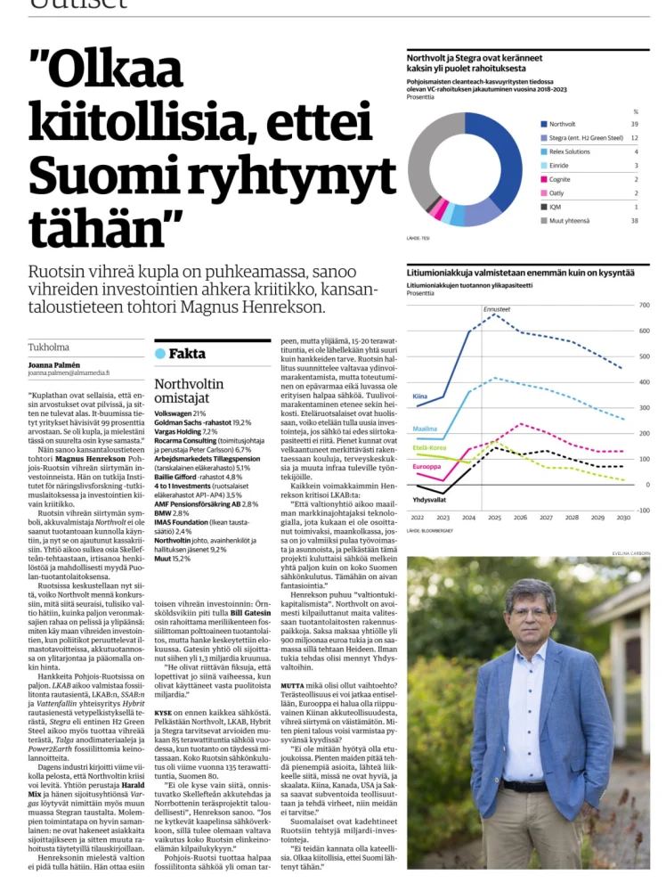 Uskon kyllä, että Suomen talous piristyy ja kasvaa markkinan mukana kunhan korot laskevat järkevälle tasolle mutta sehän ei Suomelle riitä alkuunkaan. Talouden pitäisi kasvaa selvästi enemmän, erityisesti ulkomaisia investointeja ja pääomia on pakko saada merkittävästi lisää, jotta hyvinvointivaltio olisi jatkossakin olemassa. Mutta miten niitä saadaan, missä ja mitä ovat meidän vetovoimatekijät kilpaileviin maihin verrattuna? Esim. ”Hyvä pöhinä vihreän siirtymän ympärillä” on väärä vastaus. Oikea vastaus on, ettei niitä ole. Se on sääli, koska Suomessa on potentiaalia, mutta sitä ei pystytä utilisoimaan liian korkeiden poliittisten ja ideologisten esteiden takia. Suomi on valitettavasti auringonlaskun talous ja hyvinvointivaltio. Nyt kun on ollut puhetta, että Finlandia-hymnistä pitäisi tehdä Suomen kansallislaulu, niin viimeinen lause voitaisiin samalla vaihtaa muodosta ”On aamus alkanut, synnyinmaa” muotoon ”On iltas koittanut, synnyinmaa”