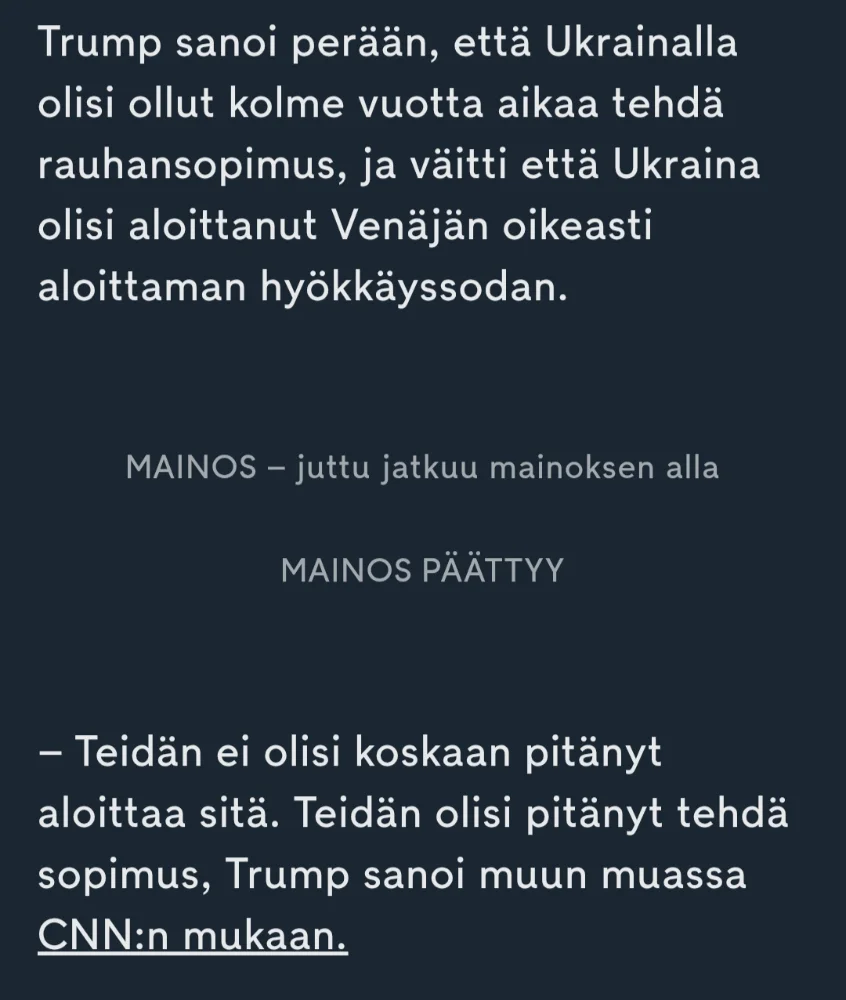 Se ei edes näytä siltä muualla kuin länsimedian propagandassa. Aika vaikea esim. selittää miksi Donu olisi kätyrinä painavasti kehottanut Eurooppaa lopettamaan venäläisen energian ostamisen ja vahvistamaan puolustustaan merkittävästi.Tai sitten asia on niin kuin se näyttää, Trump on Putinin kätyri.