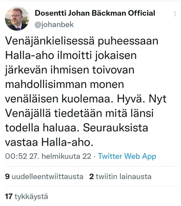 En usko, että dosentti on sekaisin. Dosentin työ on vain harhaanjohtaa Suomen tyhmintä ainesta palvelemaan Kremlin tavoitteita. Kaikki hajaannus, minkä dosentti saa aikaan suomalaisten riveissä, palkitaan kyllä. Dosentti hoitaa työnsä hyvin. Vaikka voisi kuvitella, kaikki historia huomioiden, olevan mahdotonta laittaa suomalaisia nielemään Kremlin propagandaa kaikkine ruosteisine koukkuineen, niin kyllä vain tälläkin palstalla on niitä, jotka pitävät Bäckmania jollakin kieroutuneella tavalla totuuden torvena.katso liitettä 239468