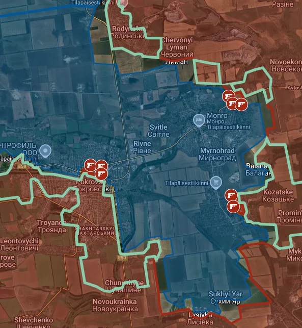 Sähän itse postasit jo samaa tilannetta, mutta valtamedia ei kerro sitä suoraan. Pokrovsk ja koksikaivos on cooked. Varmaan tärkeä etappi mitä ennen put-in ei edes neuvottele mitään. Koksikaivos yksi suurimmista koko itä-euroopassa.Weeb Unionin copekartta. Ei lähteitä ja missään muualla ei ole noita etenemisiä.