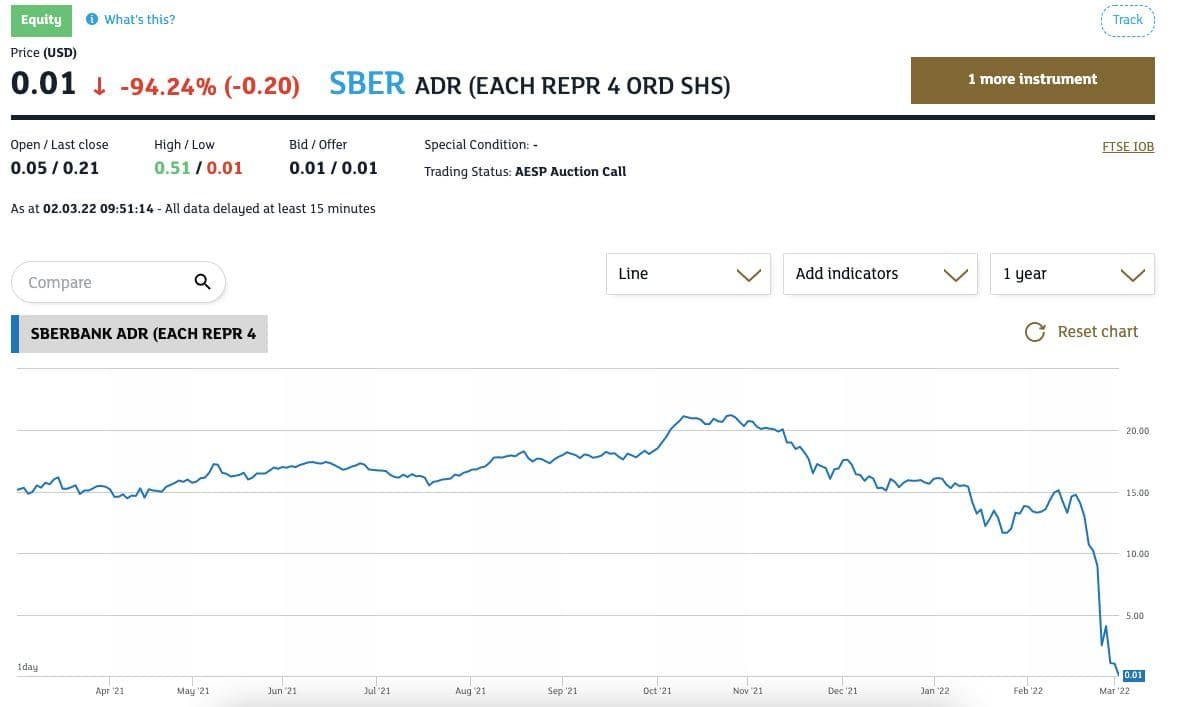 Sberbankin osake romahti keskiviikkona 80 prosenttia 0,21 dollariin Lontoon pörssissä, jossa se on rinnakkaislistattuna. Muutosprosentit ovat suuria, sillä yhtiön osakkeena arvo on nykyisin senttiluokassa.