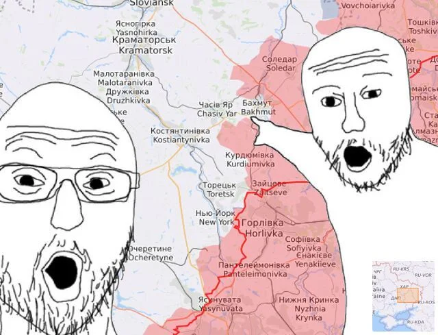 Löysin uuden meemikuvan tälle Bahmut öyhötykselle ja noista pelloilla etenemisestä intoilemiselle. Tähän pitäisi vielä lisätä noita Roopelin paintilla käsin piirrettyjä nuolia ja sen ryssäbotin kuva joka tekee noita "Bahmut falls now" tyylisiä reaktiovideoita jo neljättä kuukautta putkeen.