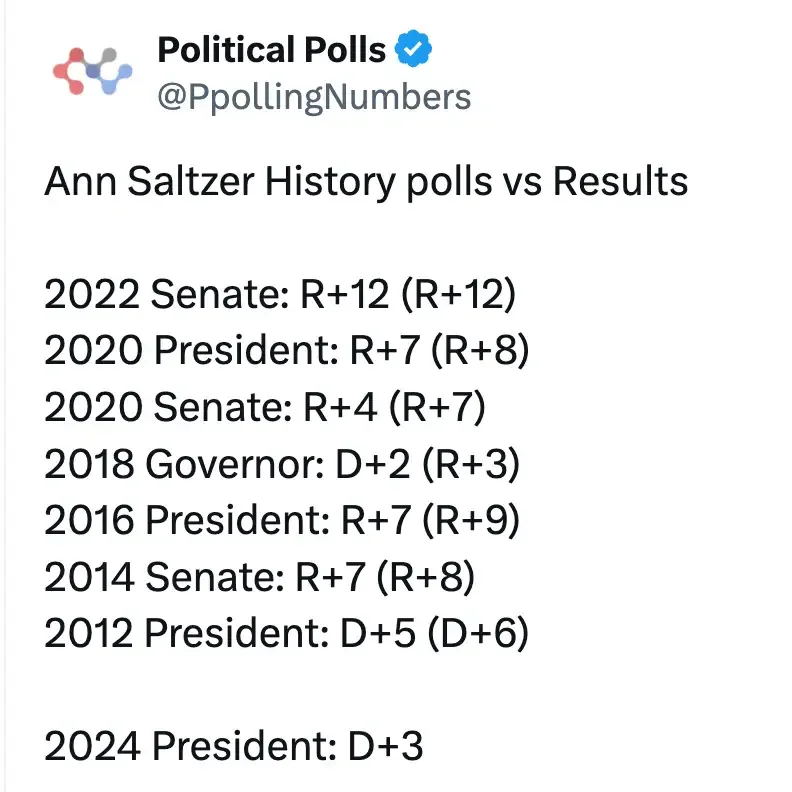 Iowan flippaaminen olisi aika kova temppu, vaikka vain 6 valitsijamiestä onkin tyrkyllä. Ei tarvitsisi ainakaan kuunnella väsynyttä selittelyä siitä, kuinka Harris voitti vain koska henkkareita ei kyselty.