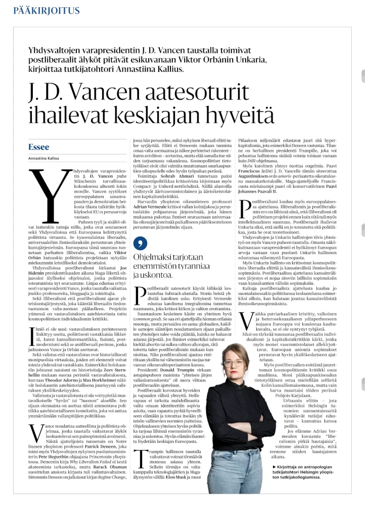 Politiikkaa mitä mekin tarvitaan. Yksinkertaista.En lakkaa ihmettelemästä miten suomalaiset näin kovin fanittavat tuota amerikkalaista poliitikkoa. Ymmärtäisin ehkä jotenkin, jos kyseessä olisi jenkki-magalaiset tukijat. Mutta en ymmärrä miksi tukea tyyppiä, joka käytännössä melkein kaikilla puheilla ja teoilla virtsaa suoraan meidän eurooppalaisten niskaan? Hämmentävää.