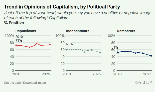 Fifty-four percent of Americans, down from 60% in 2021, have a positive opinion of capitalism, while a steady 39% view socialism positively.news.gallup.com
