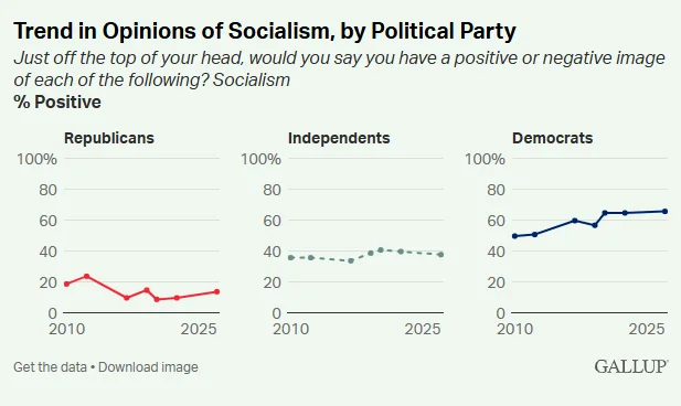 Mutta tässä tulee se todellinen pommi. 2/3 demokraateista suhtautuu SOSIALISMIIN myönteisesti. Maailman vaarallisin ja tuhoisin ideologia ja meidän pikku demokraattipallerot näkevät, että se on ihan hyvä juttu. Ymmärtäisin tuloksen Euroopassa, mutta sama Amerikassa on aivan uskomatonta. Selittää myös osaltaan miksi julkikommunistisetkin poliitikot, kuten Zohran Mamdani, kuten nauttivat korkeaa kannatusta demokraattien keskuudessa.