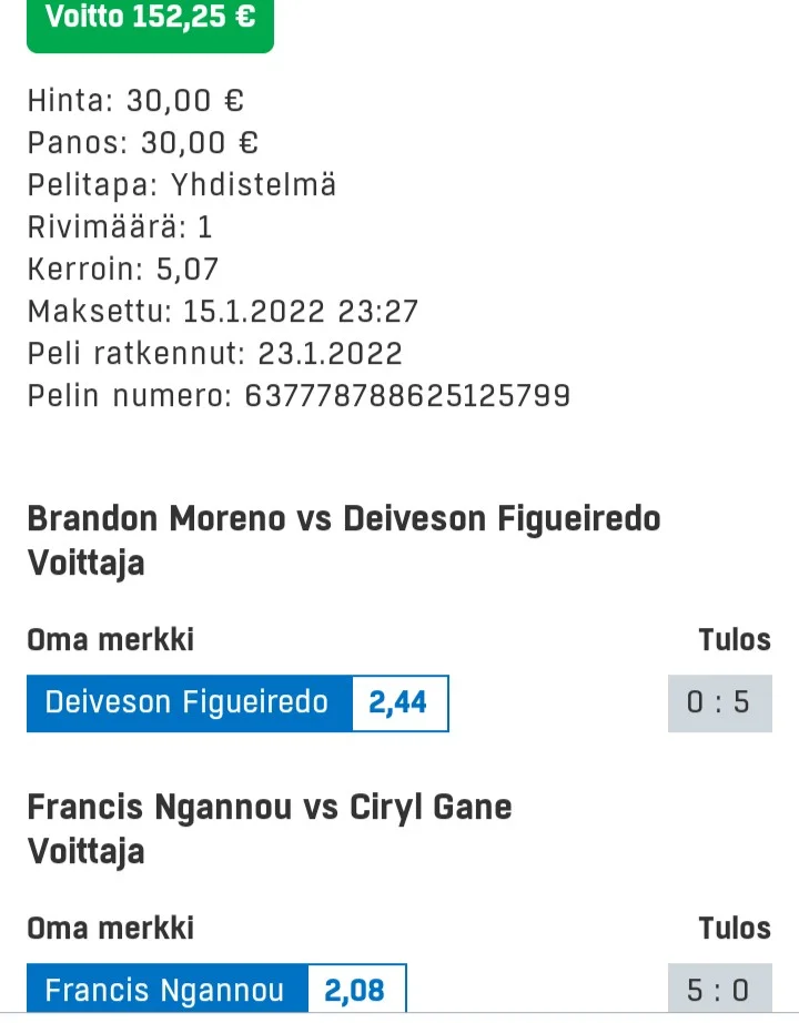 Ja muutti sitä plääniä kun huomasi että lyönneilä ei onnistu. Toki Gane aloitti sen painiosuuden ensin, mutta sen jälkeen se osa alue olikin yhteen maaliin. Kovin oli heikot litsaripotkut Ganella, olisi vetänyt sinne polvitaipeisiin ihan huolella. Varovaista oli, jabi kyl toimi.Ngannoun game plan oli kyllä timanttia. Gane palaa treenisalille, harjoittelee alasvietien puolustusta ja mattohommia vuoden-pari ja ottaa sitten mestaruuden.