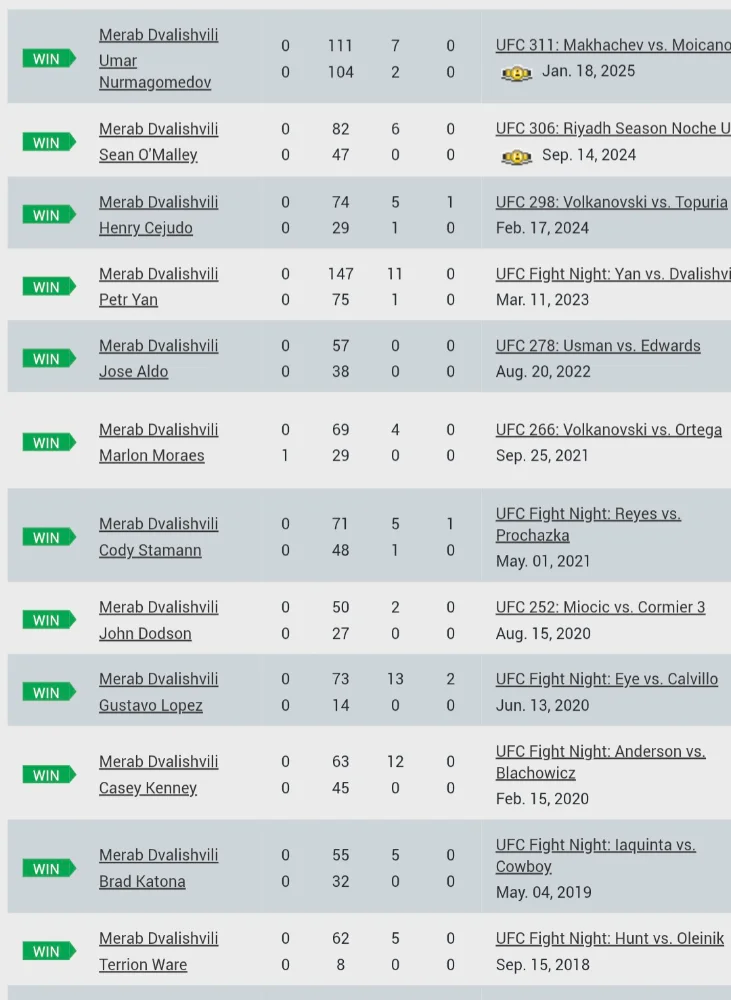 12 matsia joista 11 pisteille..Khabib 29-0, Merab 4 tappiota. Khabib 8 tyrmaystä 11 sub. Khabib 3 tittelipuolustusta ja kaikki lopetuksella. Merab 1 puolustus pistevoitto.Merabilla melkonen voittoputki. Nyt jo huomattavasti kovempi lista kuin Khabibilla.