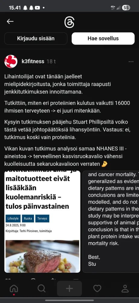 Lihaintoilijat ovat tänään jaelleet mielipidekirjoitusta, jonka toimittaja raapusti jenkkitutkimuksen innoittamana. Tutkittiin, miten eri proteiinien kulutus vaikutti 16000 ihmisen terveyteen -> ei juuri mitenkään. Kysyin tutkimuksen pääjehu Stuart Phillipsiltä voiko tästä vetää...www.threads.com