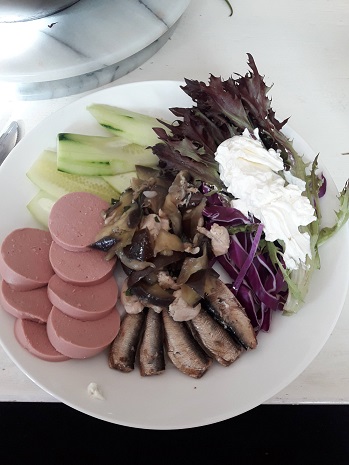 tän päivän syömiset, joka aikalailla samanlainen joka päivälle, juusto saattaa vaihdella (ei rae). lihan tilalla kalaa (lohta). joskus menee kookoshiutaleita kourallinen. ja parsa/kukkakaalia aloin ottaa tänään mukaan, jäävuorisalaatista/kurkusta ja pinaatista lähinnä tullu tähän mennessä HH tuohon 10-15.
