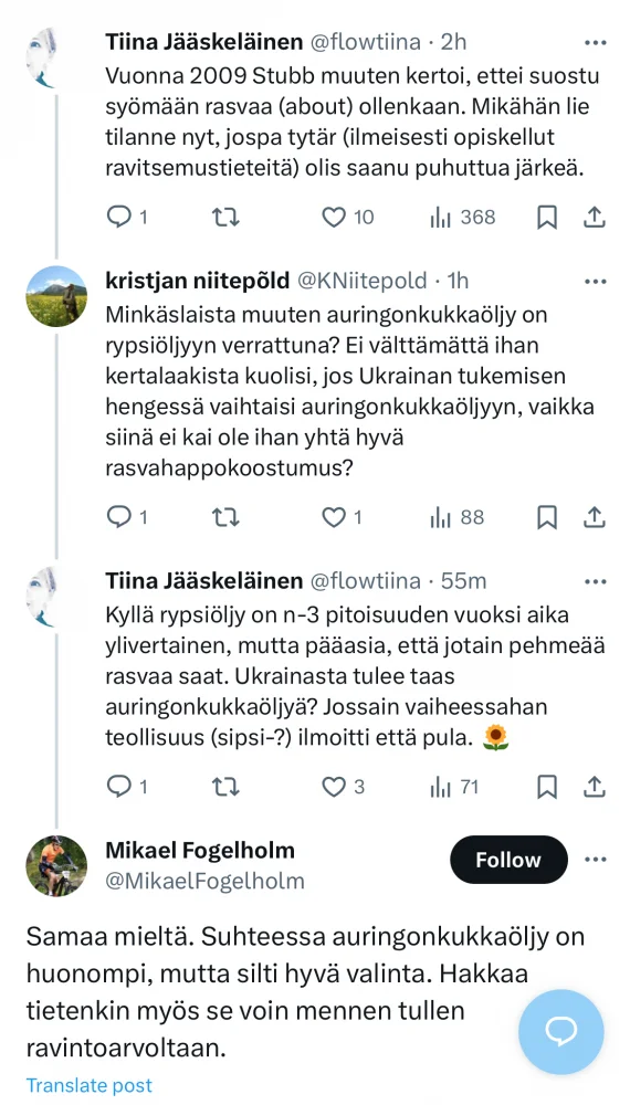 Täällä on tarinoitu rasvan laadusta, niin pistetään tähän. Dosentti ja professori pähkäilee tulevan presidentin rasvan syöntiä. Ei muutakuin auringonkukkaa pöytään! Ukrainakin kiittää.