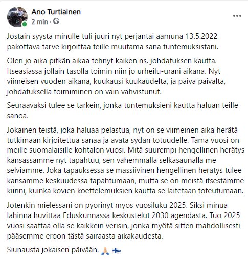 Se uskovaiskohtaus autossa oli aika nolo veto.Onkohan Ano lahjottu Venäjän trolli vai muuten vaan flipannu? Poliittisen uran alussa oli vielä jotain tolkkua jutuissa, sillon tapasinki Anon Vaasan torilla ja vaikutti tolkun mieheltä, mutta nyt alkanu tulla ihan sekopäistä juttua. Olis ollu hyvät mahikset menestyä politiikassa, mutta nyt tehny poliittisen itsemurjan ja ajanut samalla omat bisnekset konkurssiin.