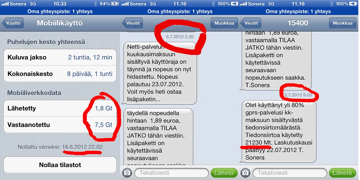 Ohessa kuva, jossa ruutukaappaus datalaskurista, sekä Soneralta tulleista viesteistä osa.