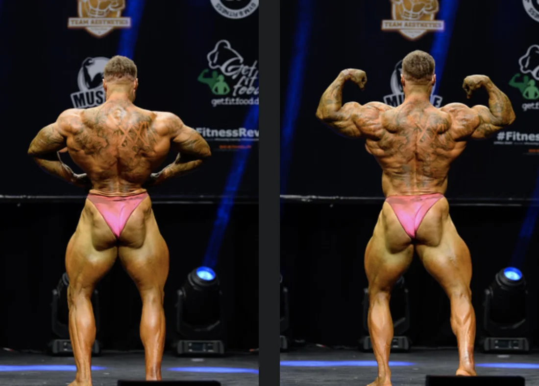 Kyllä tuplat takaa todella komea!Hassusti valaistus korostaa keskivartaloa ja tuo yläkroppaan varjoja (ojentaja lähes katoaa) aiheuttaen vääristymän, että Artturilla olisi pienet kädet ja leveämpi keskivartalo kuin todellisuudessa. Hienoa nähdä, että koko ajan alkaa homma skulata paremmin. Selkäposet ovat omaan silmään kyllä tosi kovia, mutta sheldonin pointti leveästä selästä on hyvä. Nyt oli kyllä Artturilta paras tuplat takaa -pose, jonka olen nähnyt. Artturin tuplat edestä -pose on aina häirinnyt omaa silmääni. Se on hiukan pökkelömäinen ja kasassa oleva. Fysiikkahan antaisi myöten tehdä siitä todella näyttävä Shown Rhodenin tyyliin. Kyynärpäitä ylemmäs, selkää enemmän auki, jolloin myös keskivartalo kapenee.