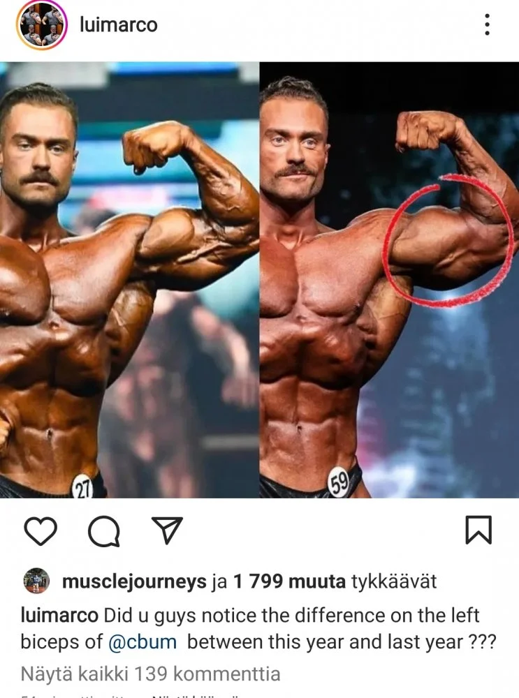 Katoin muuten että vasen on uudempi kuva.Harvemmin se hauiksen kiinnitys pitenee ku repeääTai sit vaan Hany Rambodin metodeilla jopa lihaksen kiinnityksiä saa muutettua