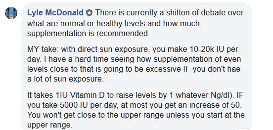 Miksi et suosittele isompia annoksia? Jos henkilöllä 50 mikrogramman annoksella D-vitamiinipitoisuus jää matalaksi, niin olet edelleen max. 50 mikrogramman kannalla? Näissä optimaalisen tason saavuttamisessa ei voida mutulla heittää kenellekkään oikeata määrää, vaan se pitäisi jokaisen verikokein testata mikä on itselle optimiannos ja käyttää samaa valmistetta. Toinen voi päästä 50 mikrogrammalla hyvälle alueelle ja toinen voi joutua +100 mikrogramman annoksiin (esim. itse). Erittäin hankalaa kyllä päästä 50 mikrogrammalla 125-150 nmol tasoille, joka monien asiantuntijoiden mukaan tavoiteltava taso (mm. Dale Bredesen suosittelee Alzheimerin ehkäisyyn/hoitoon).
