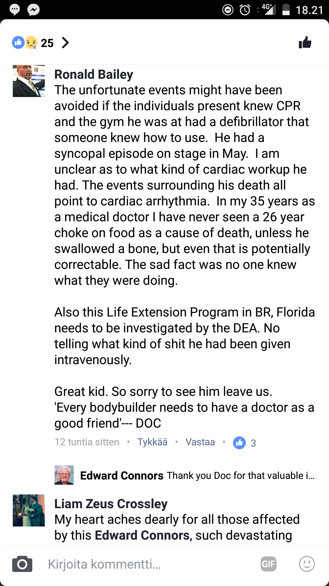 Mun teoria/veikkaus on tämänlainen: Ottanu liikaa insua ennen ruoka ateriaansa ja lähteny taju syödessä, menny siis vähän ajotukset pieleen. Sen takia on erikseen nukutuslääkärit, ettei potilas tukehdu omaan kieleensä. No nyt sattumoisin se, että on ollut syömässä sillon kun taju lähtee saattaa näyttää itse syyltä, mut ite uskon että on tukehtunu niinku pyörtyneet/tainnutetut yleensä. Olihan se pyörtyä kisoissakin, mikä tietty enempi ymmärrettävää, kun kroppa sillon vedetty äärimmillee, diureetit yms. Nyt kävi vaa tosi ohranen faili, kun pelataa isoil panoksil ja viedää hommaa ääritappiin. Mä luulen, että hyvin monella prolla on ollut läheltä piti tilanteita. Joku Ronnie on voinut olla kanssa monesti kuolla ihan samasta syystä, mut käyny "hiuka" huonompi mäihä- Anyway, hitosti surettaa tämä kun oli äärimmäisen mielenkiintonen seurata tätä nuorta massamonsteria ja asennekin oli kaikinpuolin kohillaa. :(