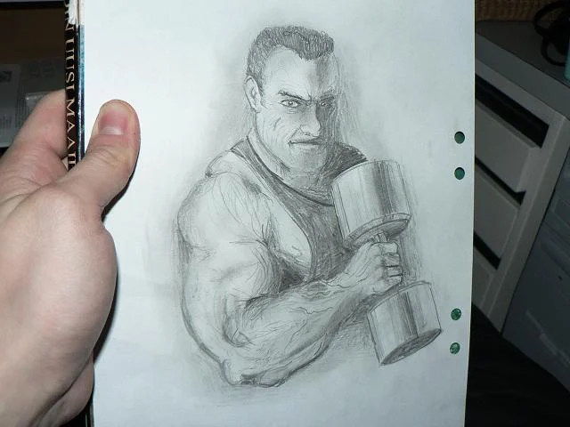 Hävettää..:nolo: Onko tuossa nyt näköä yhtään? Käsipaino ei ainakaan ole ihan balanssissa. Harmi kun ei ole skanneria ni piti ottaa kameralla kuva. Jerry jos haluat paksummat kädet tai lihaa johonkin paikkaan lisää, niin se kyllä onnistuu helposti.. ;)