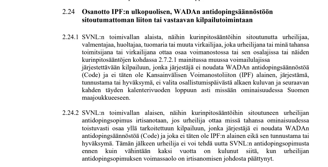 Julkisuudessa on esitetty tulkinta Suomen voimanostoliiton kurinpitosäännöistä, jonka mukaan ne estäisivät maajoukkuevalinnan urheilijan osallistuessa muun voimalajin kuin voimanoston kilpailutoimintaan silloin, kun kilpailun järjestäjä ei ole sitoutunut Antidoping -sääntöjen noudattamiseen, tai...