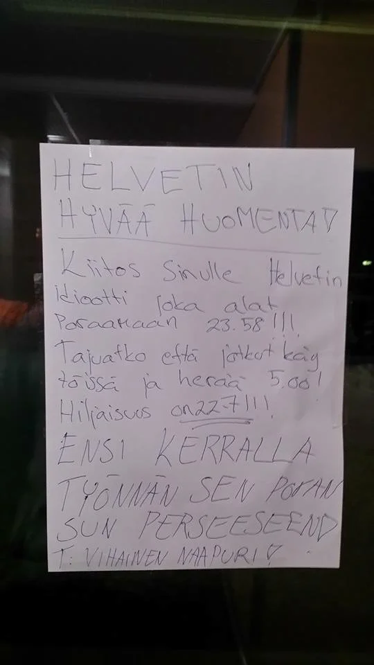 Aikanaan tuli tuollainen viesti rapun oveen kun oli eräs naapuri poraillut taulua seinälle kello 12 yöllä. Tietty järjenkäyttö on sallittua varsinkin yöaikaan noissa jutuissa mutta silti laittoi hymyilyttämään tuo viesti kun töihin oli lähdössä. Heräsin itsekin aikanaan tuohon, ja mietin että nytkö on maailmanloppu tulossa kun ei tajunnut sillähetkellä mistään mitään :D