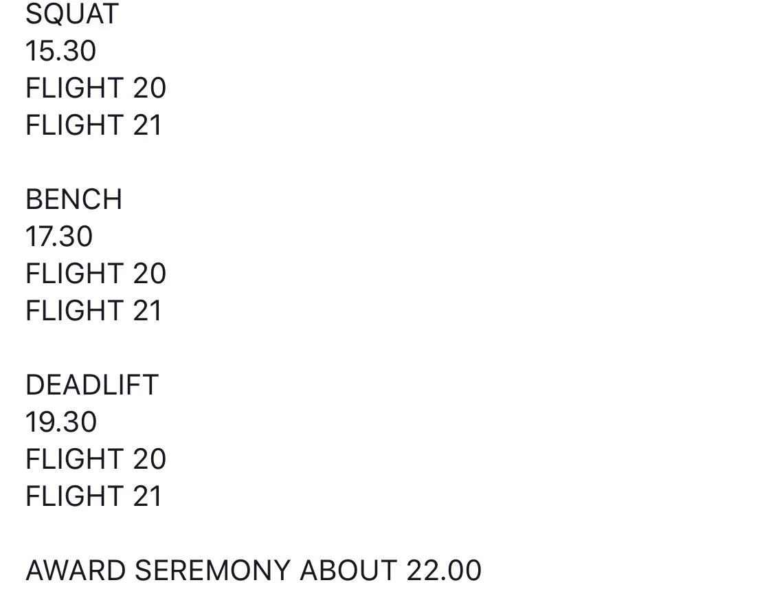 Joo tietääkseni alkaa 15.30 ja sit menee varmaan tuntia per laji about. Huomenna puntarilla varmaan selviää. Aamupaino tänään oli 115kg, täytyy repiä nyt 5kg alas että pääsis kisaamaan.