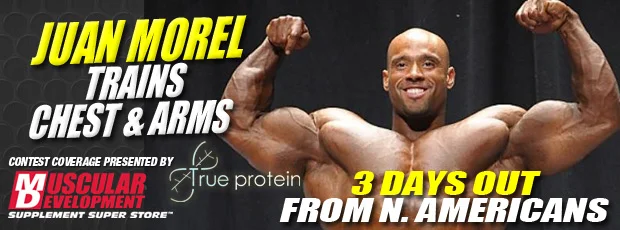 Juan Morel, who recently was super heavy runner up at the 2011 USA Championships trains chest and arms three days out from the 2011 North Americans. In this video, Morel, who says he was flat at the USAs talks about what he is doing differently with his diet compared to a month ago. He says that sunday is his cheat day and he goes all out. Also, Morel talks about who he considers his main rival, Keith Williams.