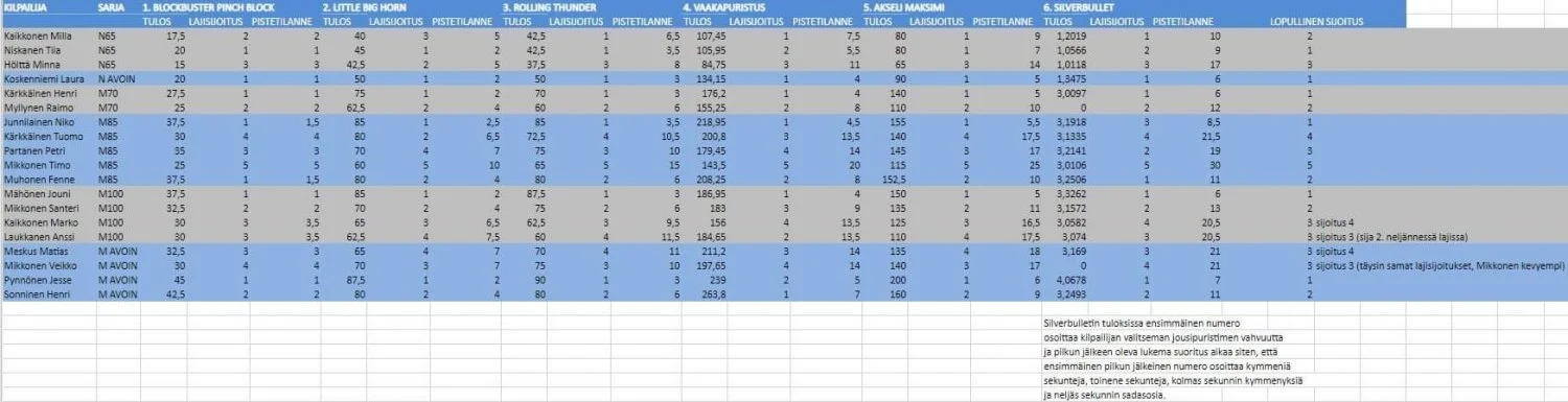 Viisi lajia alla, ehkä oli jäykkä ehkä ei #4. Tarpeeksi vahvalle ja tekniselle ei mikään 4 ole liian jäykkä. Itsellä jäänyt silver treenit pois niin asettelu kärsinyt ja kauas jäätiin 20 sekunnista. Nyt toi 6 sekkaa tuli aikalailla puristamalla yhdellä kädellä jousi kiinni luodin leveyteen mikä on kaukana optimaalisesta asettelusta.Tuli katottua kisat, ihan hyvin oli porukkaa paikalla. Oliko naisten silver bullet jousi #2? Entäs miesten silver bullet, oliko jäykkä nelonen vai verottiko aikasemmat lajit voimia niin paljon ettei meinannu kaikilla sujua?