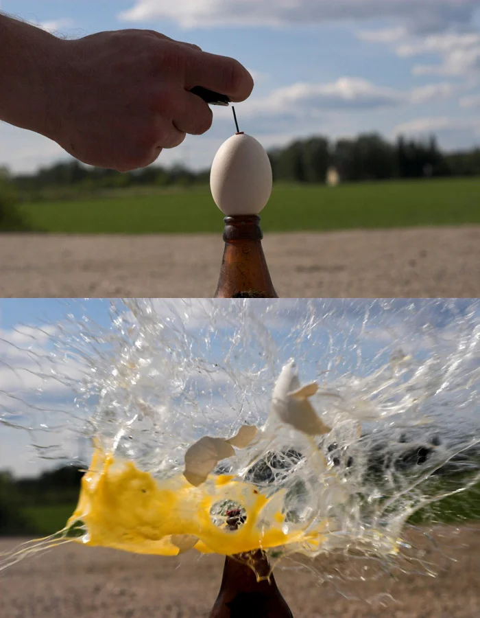 Tällä kertaa räjäytettiin kananmuna samalla periaatteella kuin tomaattikin. Toisella räjäytysyrityksellä jo sattui kuvaan. Ennen ja jälkeen kuvat :D