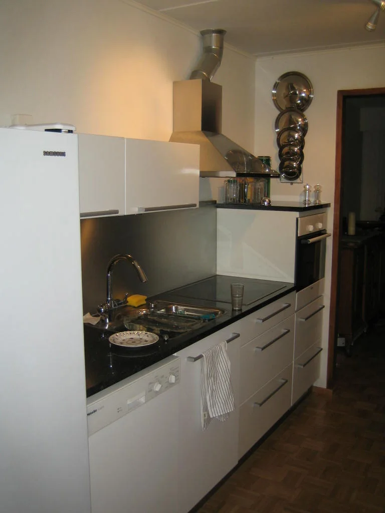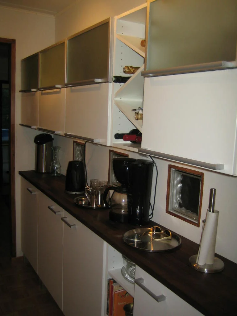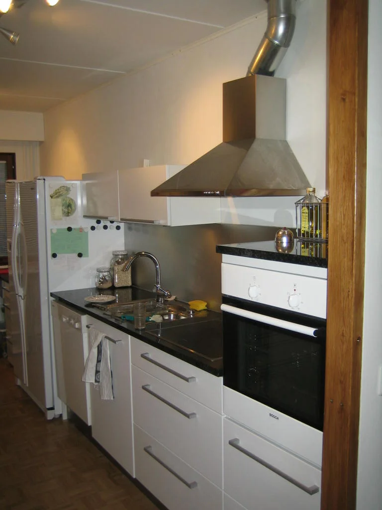 Tässä pari fotoa ennen ja jälkeen. Vanhassa keittiössä vitutti värien ja materiaalien lisäksi ahtaus ja ikkunapäädyn hukkatila, joka oli varmaan tarkoitettu sellaiselle pikku ydinperheen 4:n istuttavalle ruokapöydälle. Meillä on isompi pöytä muualla, joten laajensin köökkiä ruokailutilaan ja levensin sitä laittamalla toiselle seinustalle 30cm tasot. Kun avaruus oli teemana, niin samalla levensin toista oviaukkoa ja sahasin sisäseinään valojen kohdalle lasitiilet, joiden läpi keittiön valot nyt kivasti loistavat muualle kämppään.