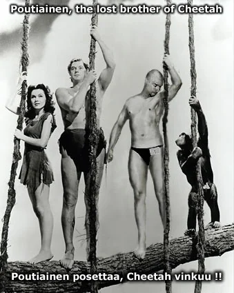 Hieno sommitelma. Ja tuo vasen käsi on niin monikäyttöinen. Jos jaksaisin, niin väsäisin kuvan jossa oikean käden ja kyljyksen välissä on mies tukalassa puristusotteessa ja vasemmalla puolella mies anelemassa armoa Poutiaisen tarjotessa kovaa kyynärpäätä. Mr P:llä tietenkin puolipaljastava village people -poliisiasu yllään.