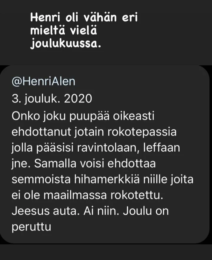 Ei helvetti miksi miksi?? Kyllä olet ämpäri kansan lammas, sylettää tuollainen porukka jotka ottaa rokotteen /rätti pysyy naamalla, teidän takia tästä pikku viruksesta on noussut/ on vieläkin iso haloo mediassa ja ihmiset paniikissa.