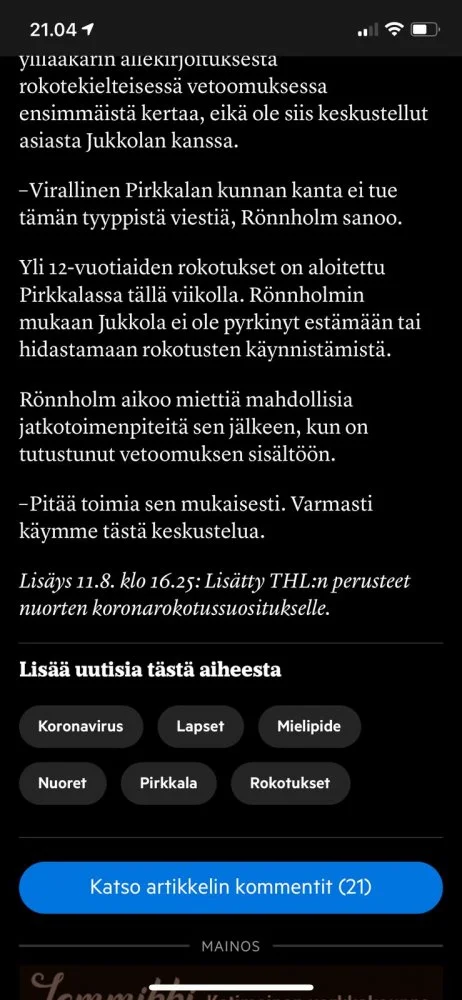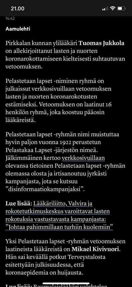 Kemppainen myös harmittelee rokotteisiin liittyvää disinformaatiota.