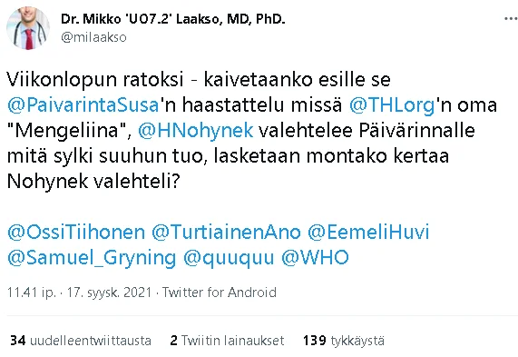 No tuo linkin tauti sentään on ollut joillain jota tiedän, koronaa ei. Tosin ei tuosta bogostantaudista mitään ihmeempää ole tullut. Avokki ihmetteli että mikä lie rutto kun näppyjä joka paikka täynnä. Nilkat ja sormet oli jonku päivän kipeänä. Ei sääskiä enää ole että tuskin loppuvat myrkyt.