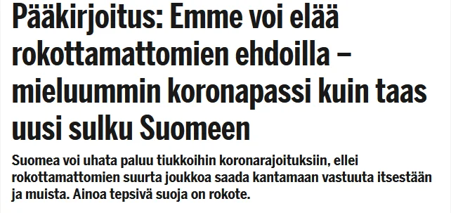 Emme voi enää elää päättäjien ehdolilla. Mieluummin avataan Suomi kaikille kuin pelätään elämää. Korona on ollut tähän asti n.2,8% ongelma. Emme voi elää tämän vähemmistön ehdoillakatso liitettä 234849