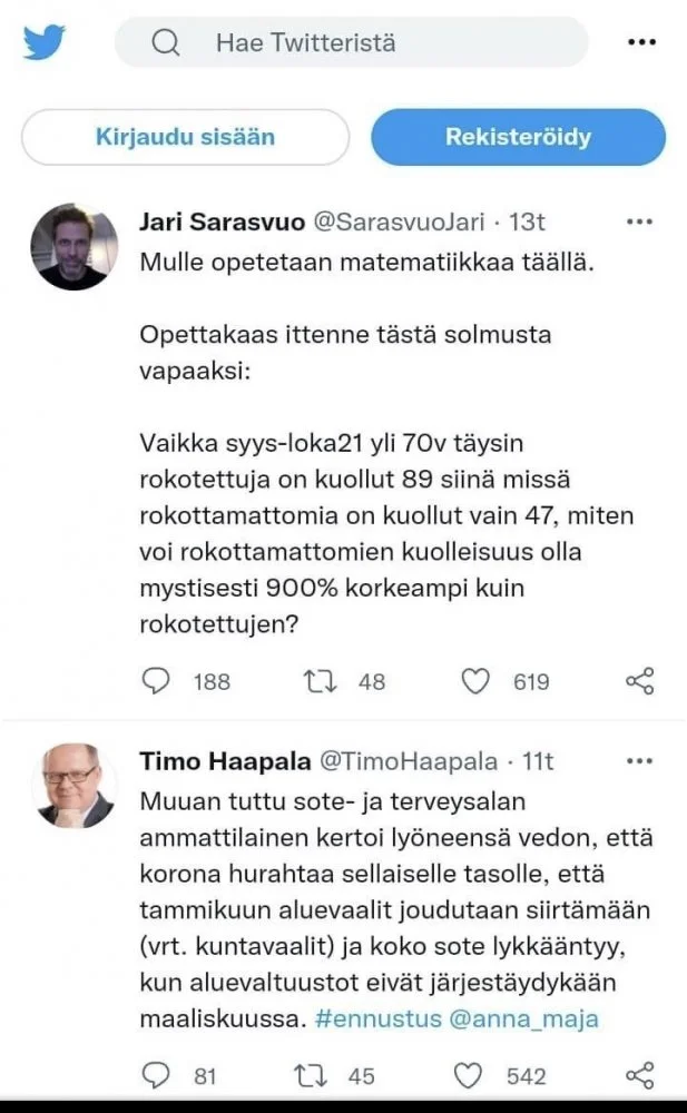 Syy terveydenhuollon kuormittumiseen ei ole mikään virus tai tauti,vaan mielivaltaiset rajoitukset,jotka muuttuvat kaiken aikaa. Rokotukset eivät ole asiaa auttaneet. Tällä hetkellä sairaaloissa hoidetaan niiden haittavaikutuksia järjetön määrä. Silti hoitoalan työntekijät monissa paikoissa pakotetaan ottamaan rokote. Pakotetaan ottamaan valmiste, joka on lääketieteelliseltä kannalta testausasteella. Olen pitkään ollut hiljaa,mutta kun ystävä ja hoitoalan työläinen yksi toisensa jälkeen saa vakavia oireita rokotuksesta ja palaa loppuun työssään, en vain enää voi vaieta.