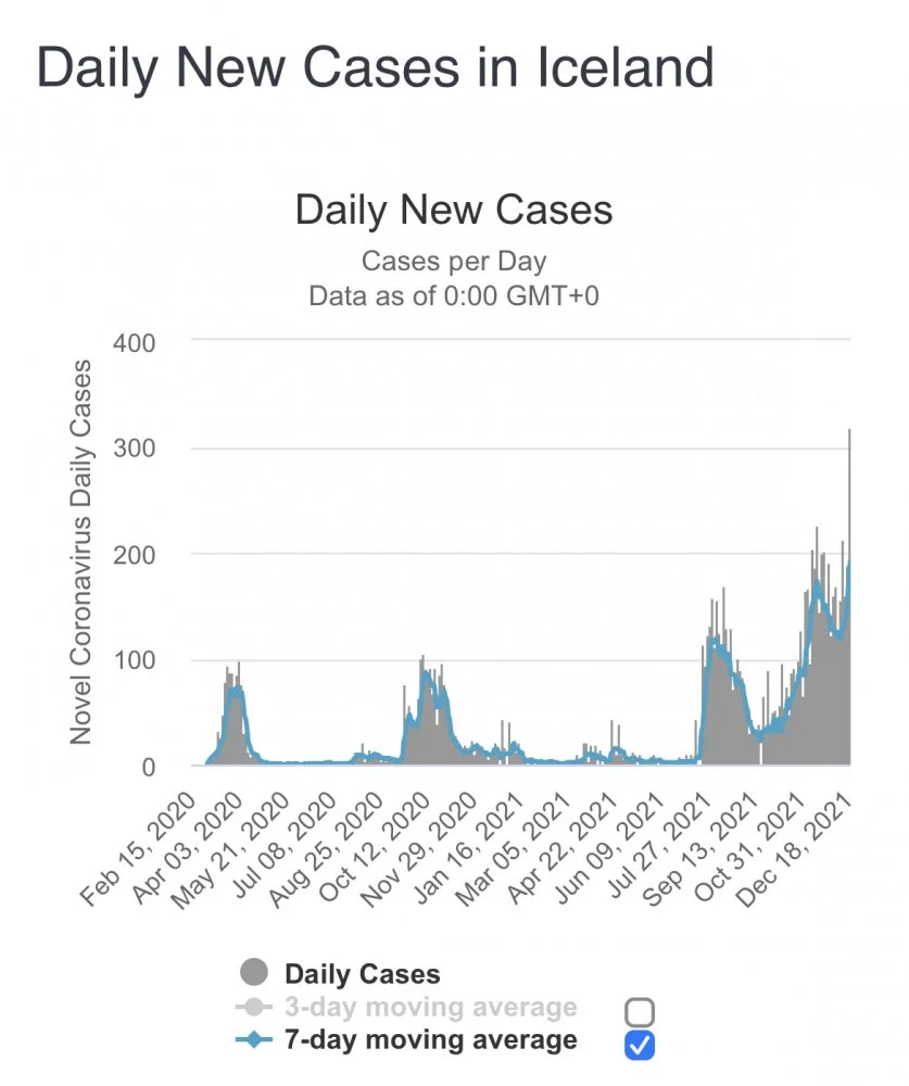 Islannissa aikuisväestö on ottanut 2 ensimmäistä piikkiään puoli vuotta sitten ja kaksi kolmasosaa heistä on ottanut tehosteen aivan hiljattain. Tuoretta rokotetta pitäisi olla jokaisella veressä, mutta niin vain virus leviää. Lääkefirman johtajat saavat taas palkkansa eteen vakuutella, kuinka kolmas rokote estää ainakin 99 prosenttia tartunnoista.Islannista voisivat soittaa Suomeen ja kertoa että boostereilla ei saada ceissejä kuriin.