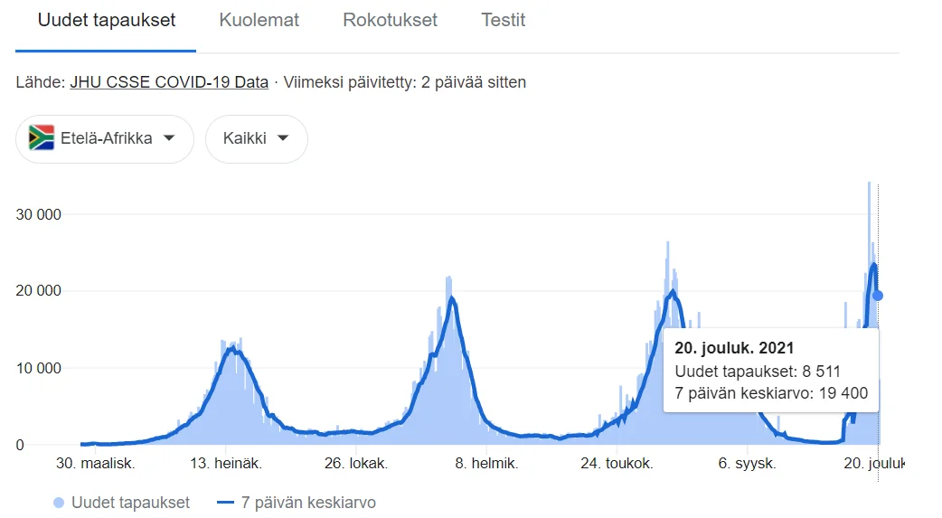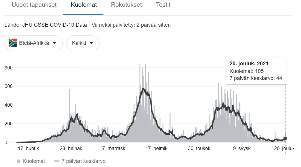 Jos katsotaan Okahvinkeittimen variantin leviämistä sen väitetyllä alkulähteellä Etelä-Afrikassa, niin uusissa tapauksissa huippu piikkasi jo ja ollaan jo taas laskevalla trendillä. Koko pandemian alusta lähtien Okahvinkeittimen varianttiin asti ollaan tehty uusissa tapauksissa koko ajan uusia higher high arvoja trendeissä, joka kertoo siitä, että uusi aalto leviää aina entistä helpommin. Sen sijaan kuolleisuudessa huippu oli jo tämän vuoden tammikuussa, jonka jälkeen ollaan jo tehty yksi lower low ja tämä Okahvinkeittimen variantti tulee todennäköisimmin tekemään taas uuden lower lown, joka tulee jo olemaan kohtuullisen matala. Tämä tullee siis jatkumaan, kunnes laumaimmuniteetti saavutetaan. Just let it rip through.