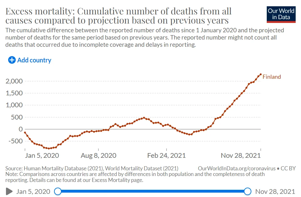 Laitas 10v ajalta2283 hlö ylikuolleisuus 28.11.2021 mennessä alkaen 5.1.2020. Eli hyvin näyttäisi menevän. Pitääkö alkaa kohta muuttamaan koronaan kuolleiden määritelmiä, kun alkaa käyrä vetämään tähän tahtia koilliseen? Ehkä seitsemäs boosteri auttaisi asiaa?