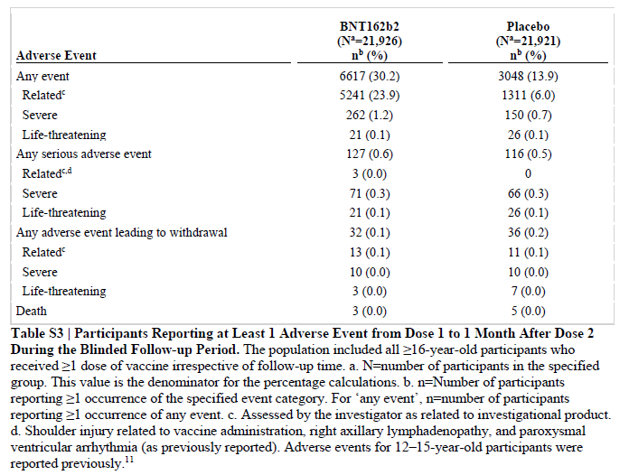 Taulu S3 tutkimuksesta ekan annoksen - 1kk tokan annoksen jälkeen, vakavia haittavaikutuksia 262 rokoteryhmässä ja 150 placebossa.