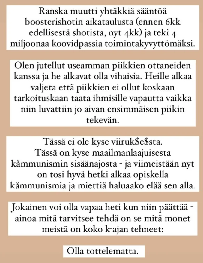 Se on nimenomaan täysi vitse terveydellisestä näkökulmasta. Todellinen motiivi lienee onkin se, että yritetään edes jollain tavalla ajaa sisään ihmisten lisäkontrollimekanismeja tulevaisuutta varten, kun natsipassi kyrvähti kasaan.Tää lakiesitys on kyllä ihan täysi vitsi, kuten työelämän koronapassikin oli.