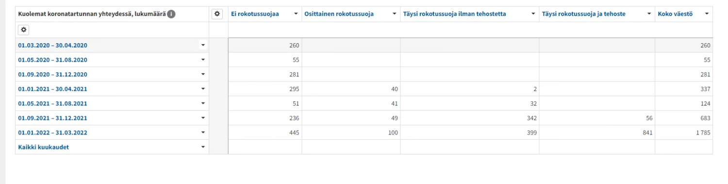 Rokote runkkaajalla on tuohonki selitys jos piikkiä eivät saaneet ajoissaVaimon työpaikalla hoitoalalla vanhus ja päihdepuolella on kuollut huomattavasti enemmän asukkaita rokotusten alettua, kuin edellisinä vuosina. Yhtään korona tapausta ei kuitenkaan ole asukkaiden keskuudessa ollut. Neljäs rokotekierros juuri saatu päätökseen heille jotka ovat vielä hengissä.![]()
