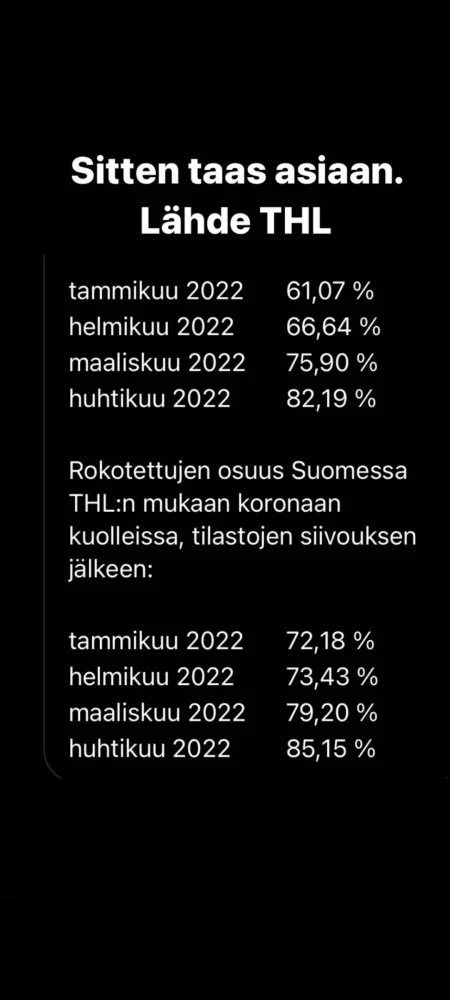 Tuohan olisi ihan linjassa sen kanssa, mitä siinä yhdessä (muistaakseni tanskalaisessa) tutkimuksessa havaittiin, että Pfizerin ja Modernan rokotteilla ei ollut vaikutusta kuolleisuuteen.