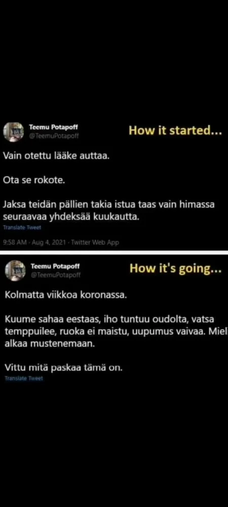 Tai sitten kolmatta viikkoa.Ja piakkoin laittaa someen kuvan positiivisesta testitikusta saatetekstillä "Todella kipeä olo jo kolmatta päivää, onneksi olen ottanut rokotteet! Ties kuinka paha olisi ollut ilman niitä!"