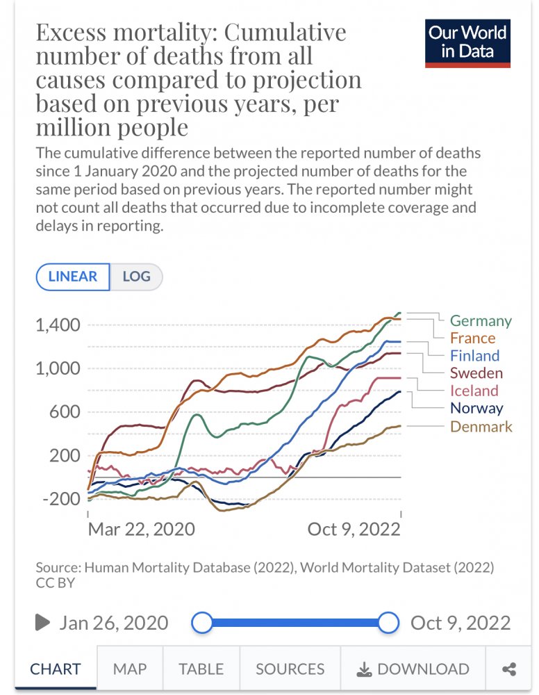 Tuo on kyllä huolestuttavaa, että tässä vaiheessa kukaan ei varmuudella pysty sanomaan, mistä ylikuolleisuus johtuu. Varmuudella osataan ainoastaan sanoa, mistä se ei johdu. Toki sekin parempi kun ei mitään. Onpahan yksi syy suljettu pois, eikä sen tutkimiseen tarvitse käyttää turhaan aikaa.Suomen tämän hetkinen ylikuolleisuus kuitataan sillä, että kansa on tullut yhtäkkiä vanhaksi. Vissiin sama kaikkialla Euroopassa?