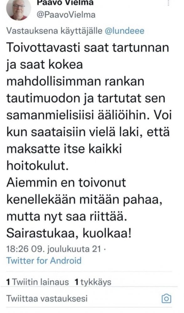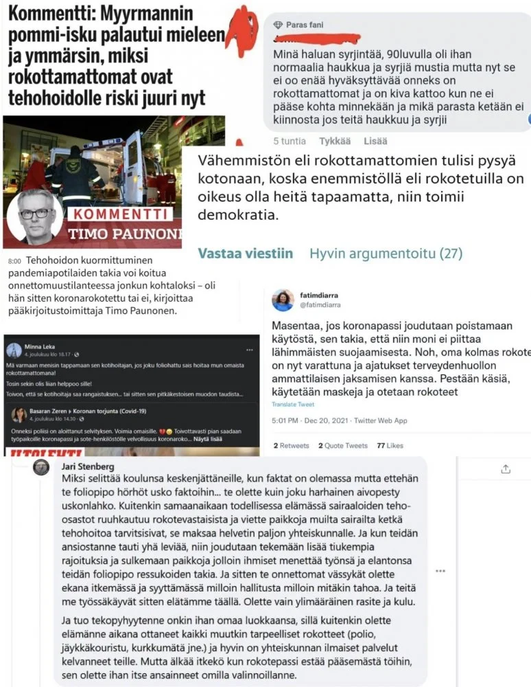 Nyt omat vanhemmatkin pelkää, että kohta ei voi enää tehdä mitään kun koronatilanne on niin paha ja pahenee. No ehkä näin, mutta mistäs luvuista sen nyt sitten voi todeta? EIkö viime keväällä ollut aika synkät lukemat tartunnoissa ja kuolemissa, mutta ketään ei oikein kiinnostanut koska Ryssät vs. Ukraian ja Kiuru out? Koskas se Kiuru palas takaisin remmiin? Viikko sitten? Vittu miten nopea käänne! Viikonko verran vähän uutisointia ja Kiurun päättömiä lausuntoja ja jo alkaa porukka tutista ja vaatia itse itselleen NAAMAVAIPPOJA, rajoituksia ja varmaan sitä vitun NATSIPASSIAkin takaisin.
